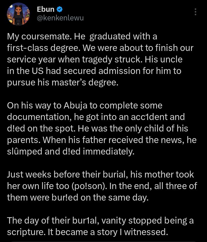 “On the day of their burial, vanity stopped being a scripture. It became a story I witnessed,” the eyewitness said, reflecting on the emotional weight of the tragedy.