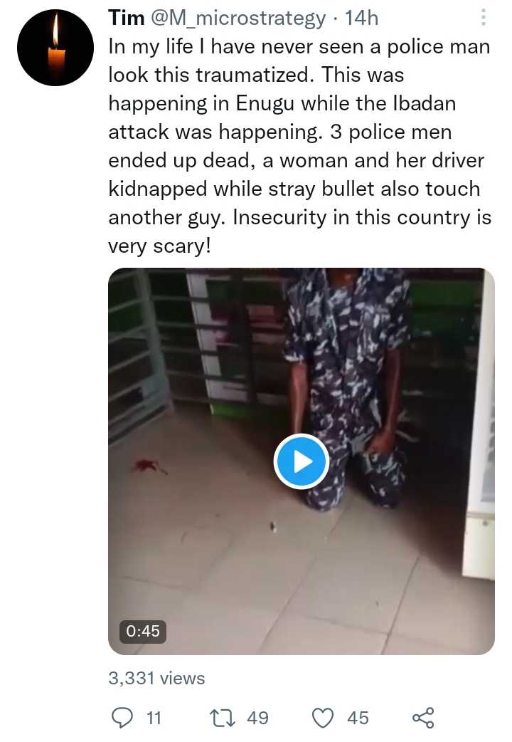 “In my life I have never seen a police man look this traumatized. This was happening in Enugu while the Ibadan attack was happening. 3 police men ended up dead, a woman and her driver kidnapped while stray bullet also touch another guy. Insecurity in this country is very scary!”