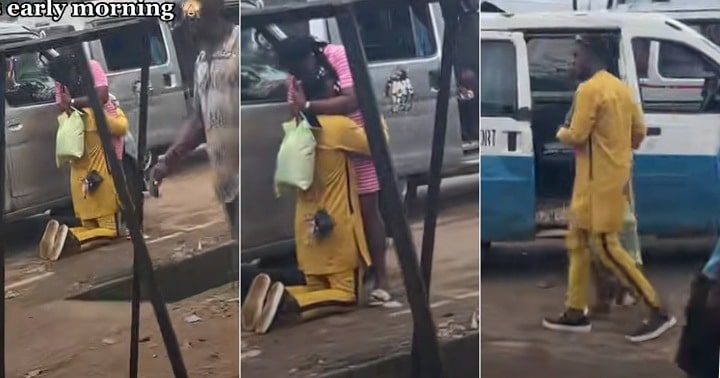 A TikTok user identified as @mimimoregrace shared a video capturing the young man kneeling in front of his girlfriend while she hugged him in what seemed to be a motor park.