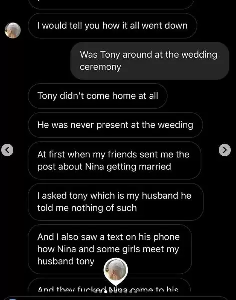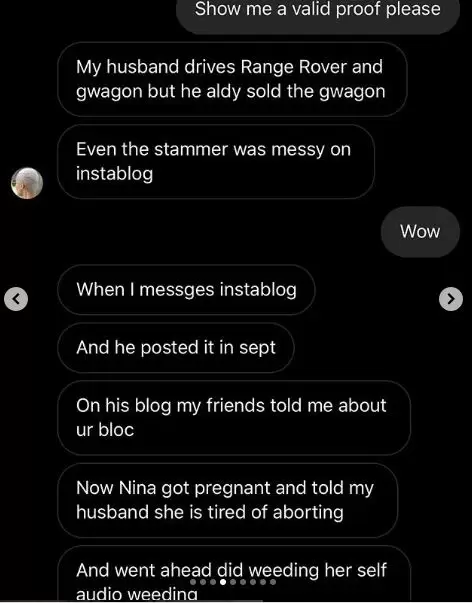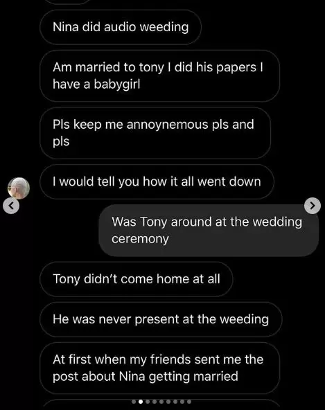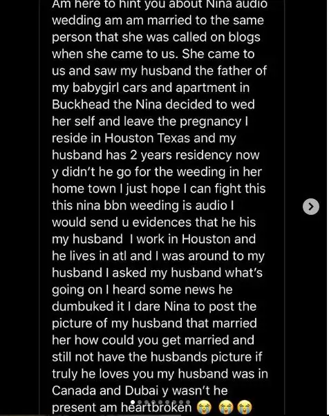 A woman has claimed to be the wife of the man whom former BBNaija reality TV star, Nina, just got married to.