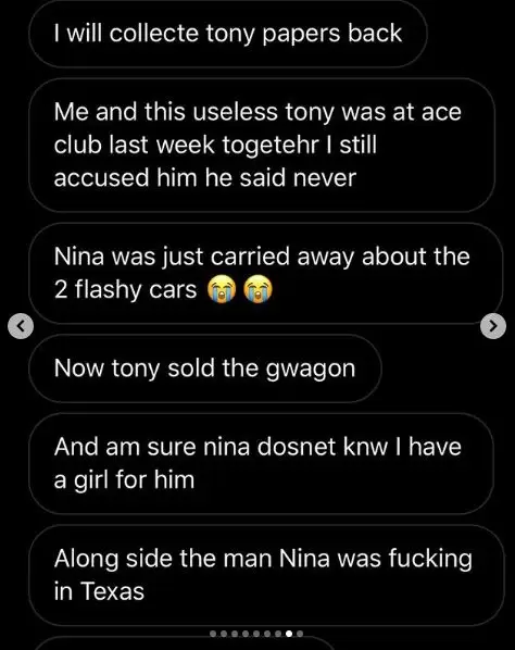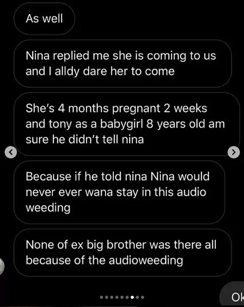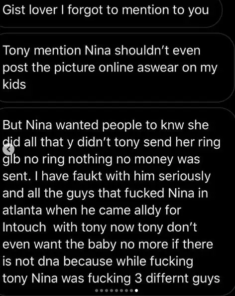 According to her, Nina who had had abortions for the man decided to keep this one to his disapproval.
