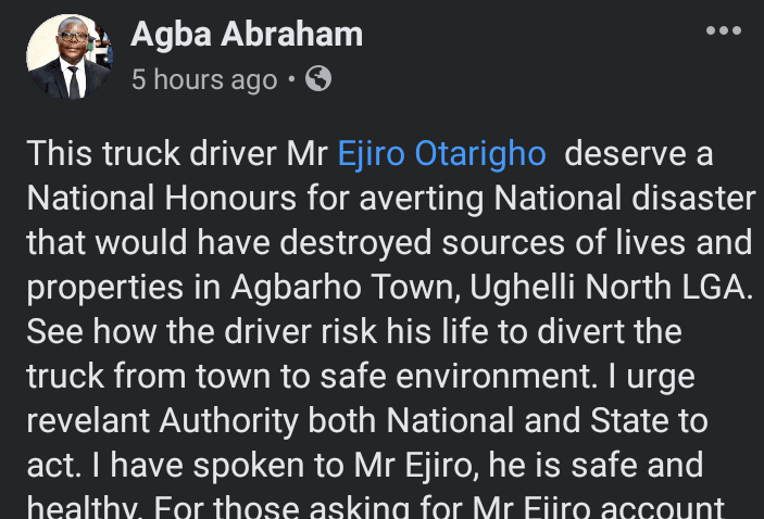 Agba Abraham wrote: “This truck driver Mr Ejiro Otarigho deserve a National Honours for averting National disaster that would have destroyed sources of lives and properties in Agbarho Town, Ughelli North LGA. See how the driver risk his life to divert the truck from town to safe environment. I urge revelant Authority both National and State to act. I have spoken to Mr Ejiro, he is safe and healthy.