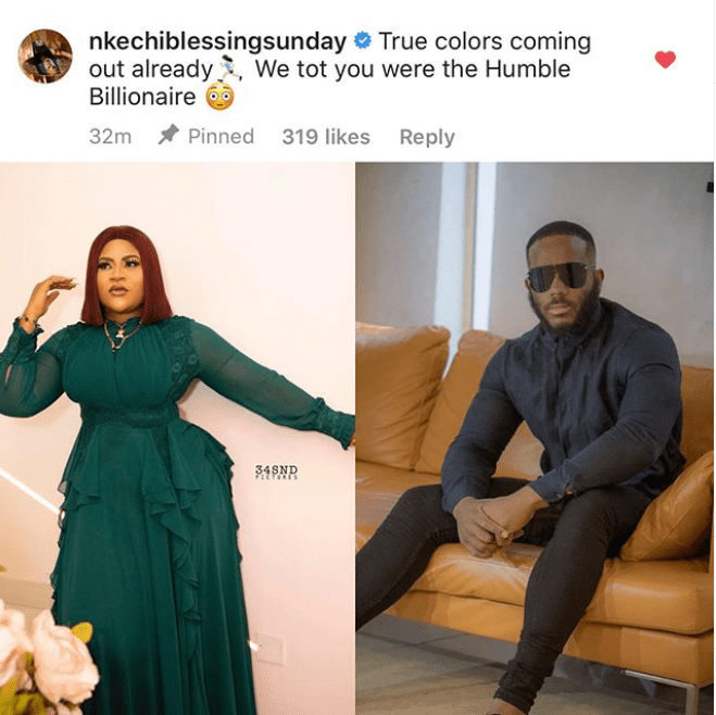 Reacting Nkechi wrote on Instagram; “True colors coming out already. We tot you were the humble billionaire“.