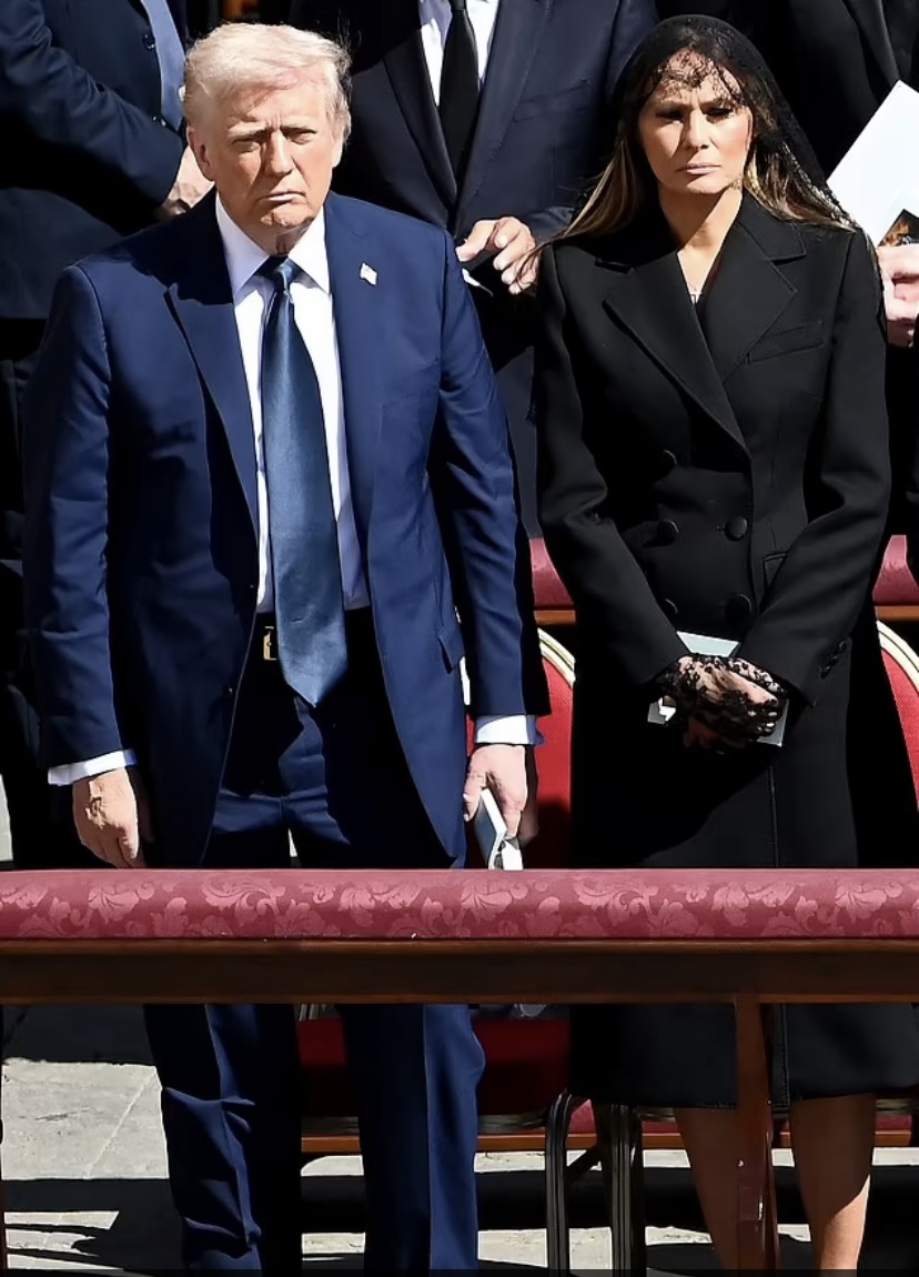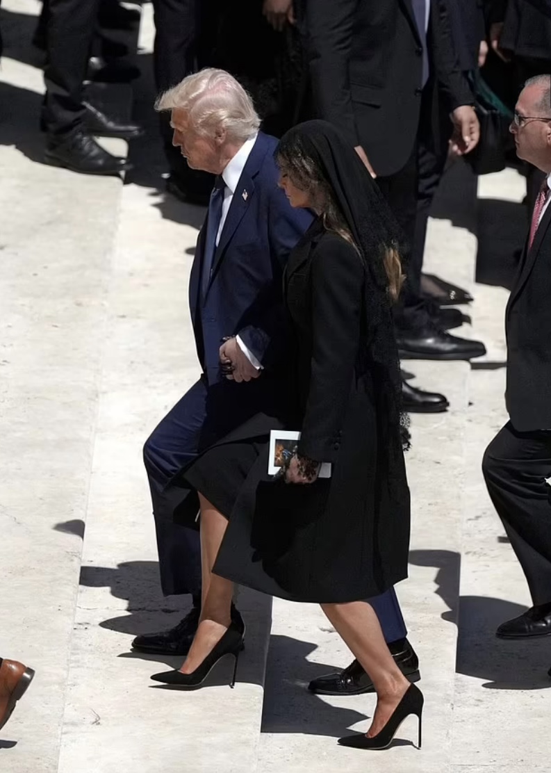 Melania Trump, who attended the funeral on her 55th birthday, wore a black coat, lace veil, gloves, and a simple diamond-studded cross pendant, adhering to the dress code for women, which required long black dresses, gloves, and veils.