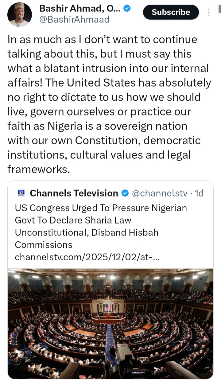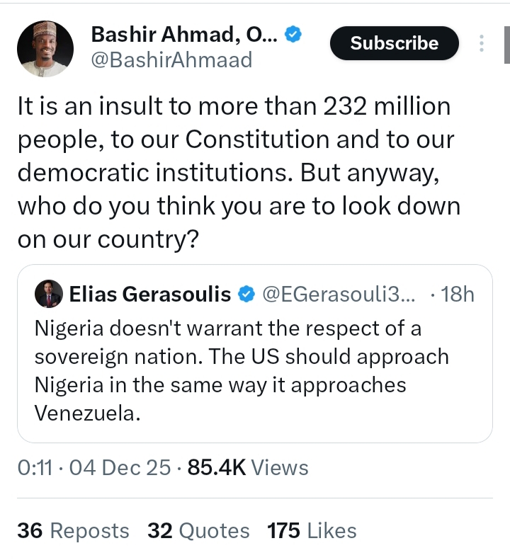 The disagreement began after Bashir Ahmad criticized perceived foreign interference in Nigeria’s internal affairs, stressing that the United States had no right to dictate how the country should govern itself.