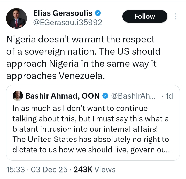 The explosive back-and-forth has generated widespread reactions on social media, with many Nigerians condemning Gerasoulis’ comments as disrespectful and inflammatory, while others debated the broader issues of governance, sovereignty, and foreign perception of Nigeria’s political system.