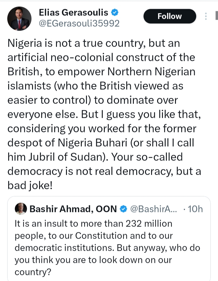 A heated online exchange between Elias Gerasoulis, a vocal supporter of U.S. President Donald Trump, and Bashir Ahmad, former aide to ex-President Muhammadu Buhari, has stirred controversy and ignited conversations about Nigeria’s sovereignty and democratic credibility.