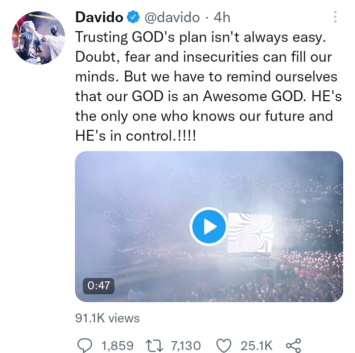 “Trusting God’s plan isn’t always easy” – Davido says as he recalls man who told him they’d cancel his show (Video)