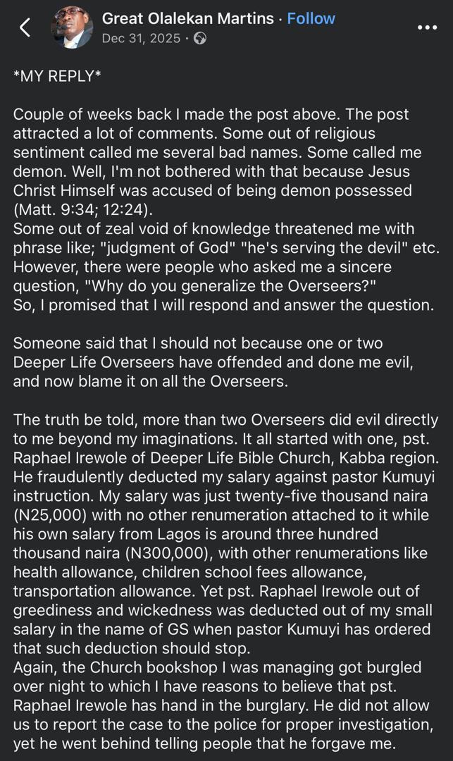 In a Facebook post, the pastor alleged that more than two Deeper Life overseers wronged him, particularly during his posting to the Kabba region.