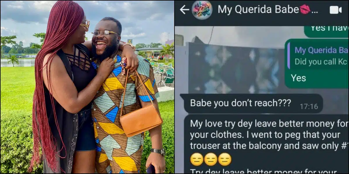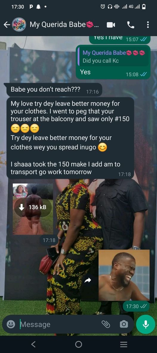“Try dey leave better money” – Man releases chat as wife knocks him after seeing N150 in his trousers