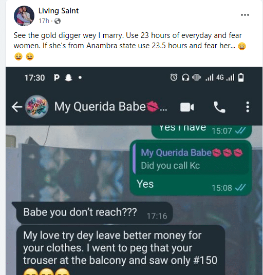 In the chat which he shared, the wife expressed her disappointment in him for leaving the paltry sum of only 150 naira in his pocket and she had seen it when she wanted to hang it to dry on the balcony.