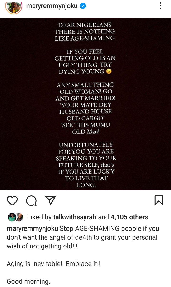 Popular Nollywood actress, Mary Remmy Njoku has advised Nigerians to stop age-shaming people.