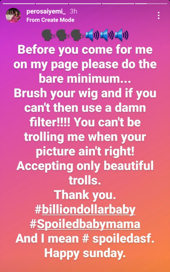 “Before you come for me on my page, please do the bare minimum. Brush your wig and if you can’t then use a damn filter. You can’t be trolling me when your picture ain’t right. Accepting only beautiful trolls. Thank you.”