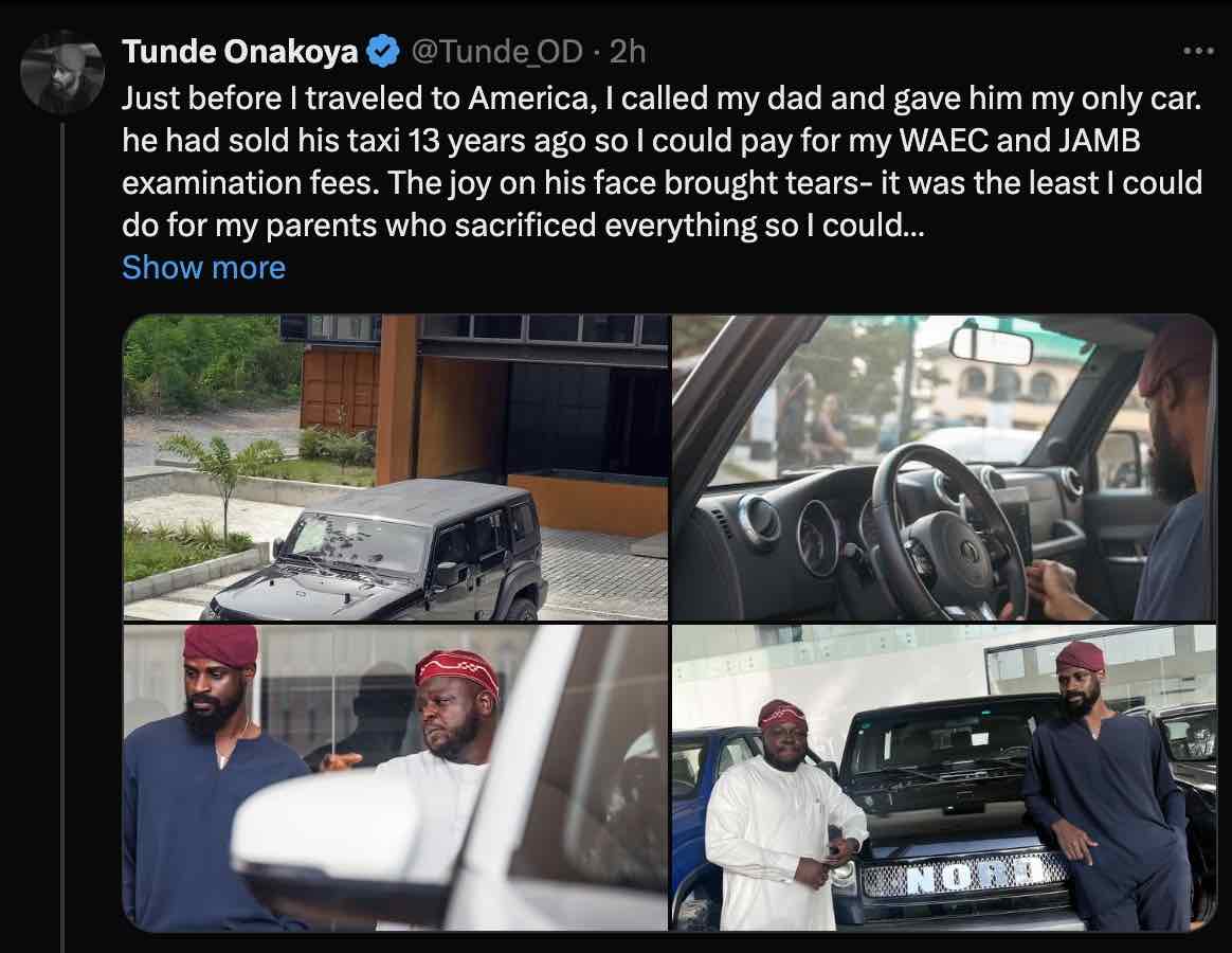 “Just before I traveled to America, I called my dad and gave him my only car. he had sold his taxi 13 years ago so I could pay for my WAEC and JAMB examination fees. The joy on his face brought tears- it was the least I could do for my parents who sacrificed everything so I could get an Education.