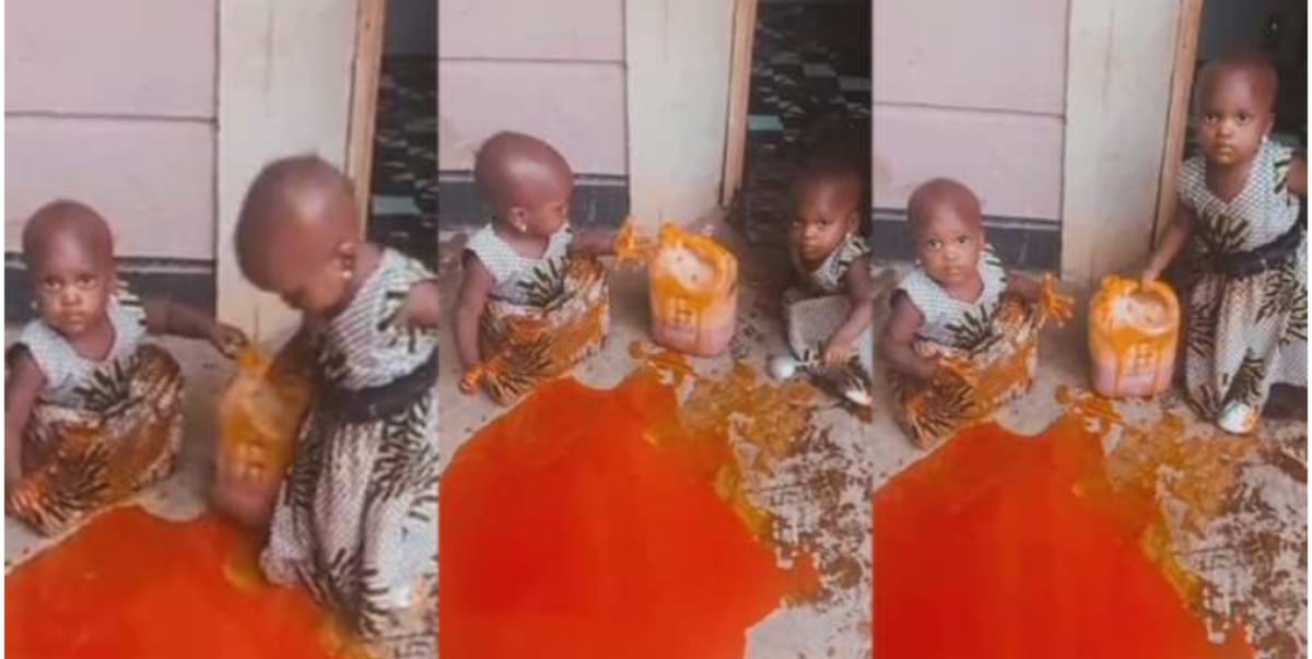 Twin babies turn their mum’s expensive palm oil into a playful mess, leaves mother confused (Video)
