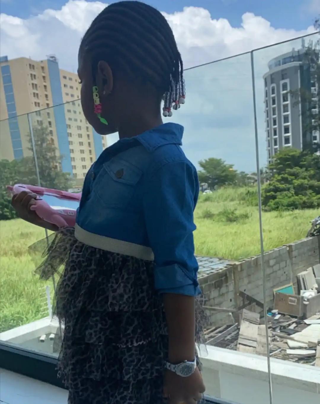 Davido shared a couple of photos on his Twitter handle. In the photos, Davido was spotted with daughter, Imade in their house in banana island.