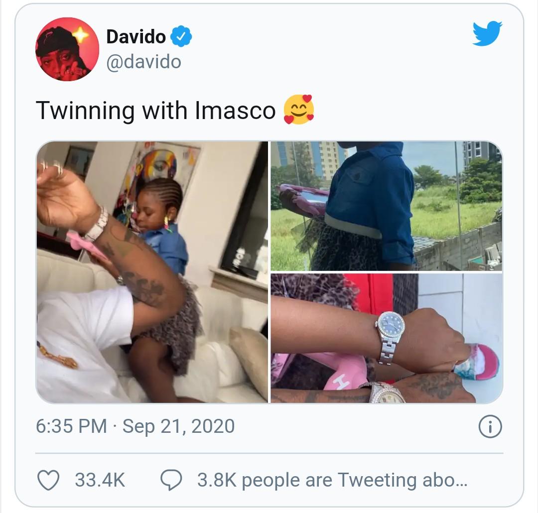 “Twinning with Imasco” – Davido says as he rocks matching wristwatch with daughter, Imade (Photos)