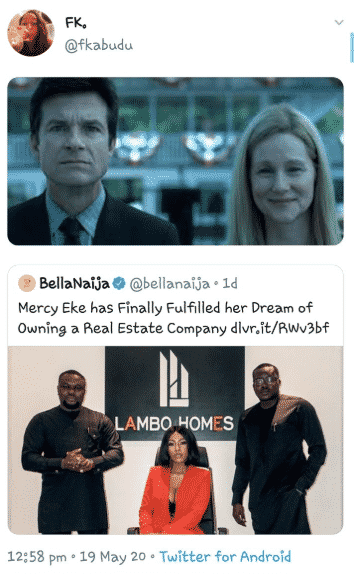 FK Abudu used Ozark’s Marty Byrde and his wife Wendy’s photo to insinuate that Mercy’s newly launched real estate company, Lambo Homes is used for money laundering.