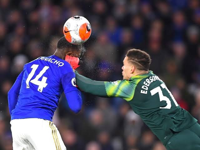 Leicester City striker, Kelechi Iheanacho was wiped out by Manchester City goalkeeper, Ederson, five minutes before half-time in Leicester’s 1-0 defeat on Saturday, after he collided with the Brazilian as they both competed for the ball.