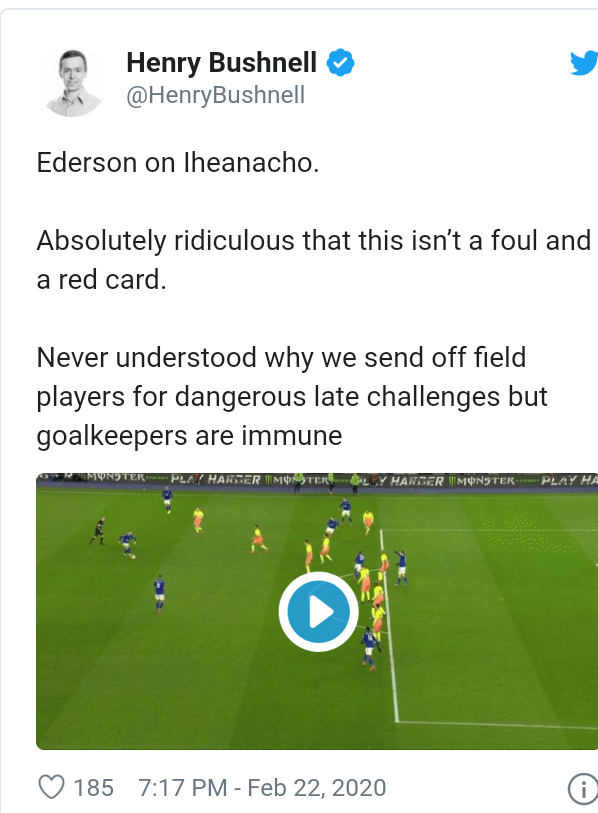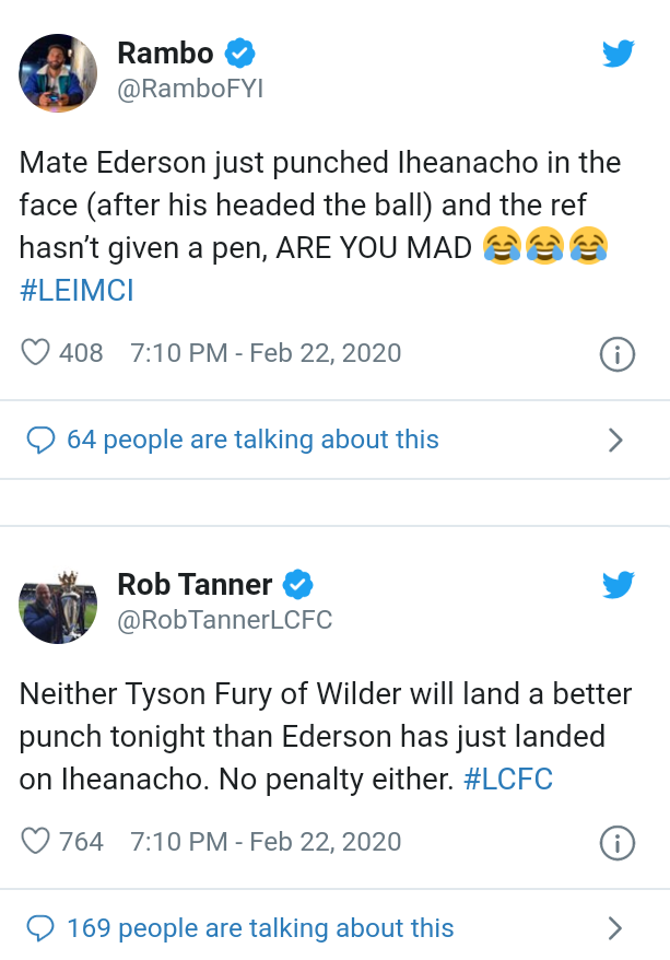 No penalty or red card was given and now some football fans on Twitter have come out to blast referee Paul Tierney and Video Assistant Referee (VAR) for not sending off Manchester City goalkeeper Ederson, after the ”reckless challenge,” with one user comparing Ederson’s punch to that of heavyweight boxers Deontay Wilder and Tyson Fury.