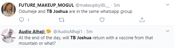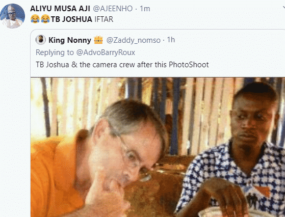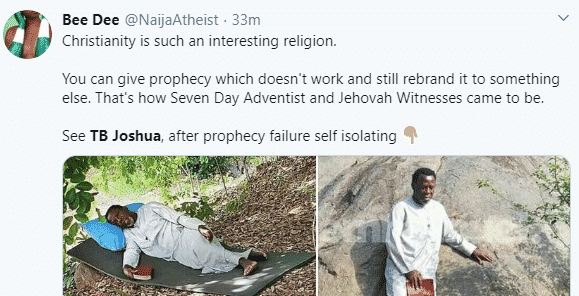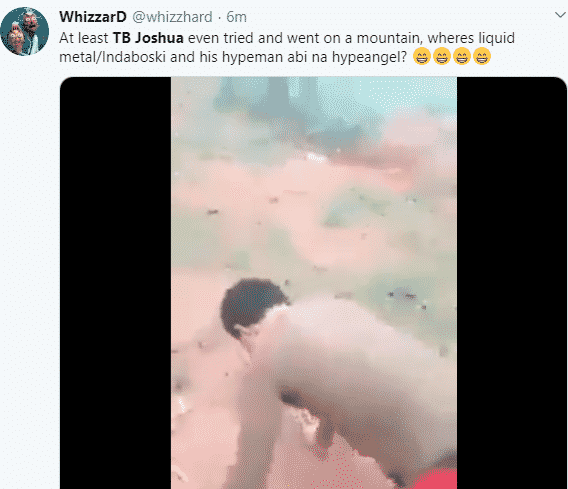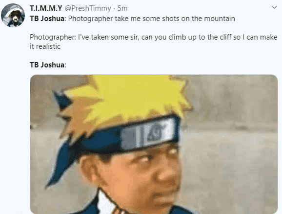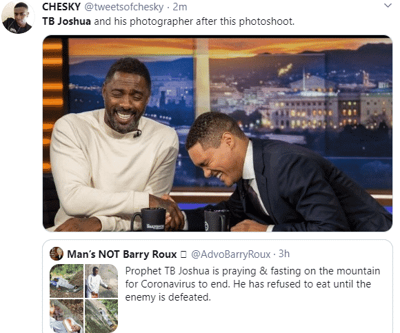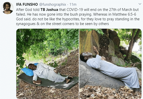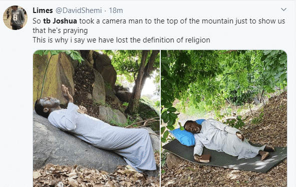 Nigerians on Twitter are reacting to photos and video of Prophet T.B Joshua of the Synagogue Church of All Nations praying on the mountain against the COVID19 pandemic in Nigeria and the world in general.