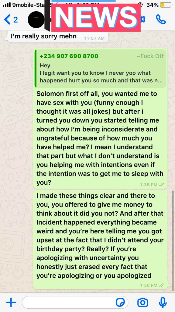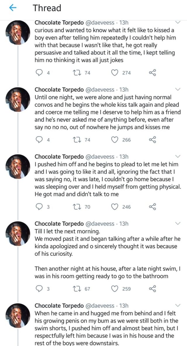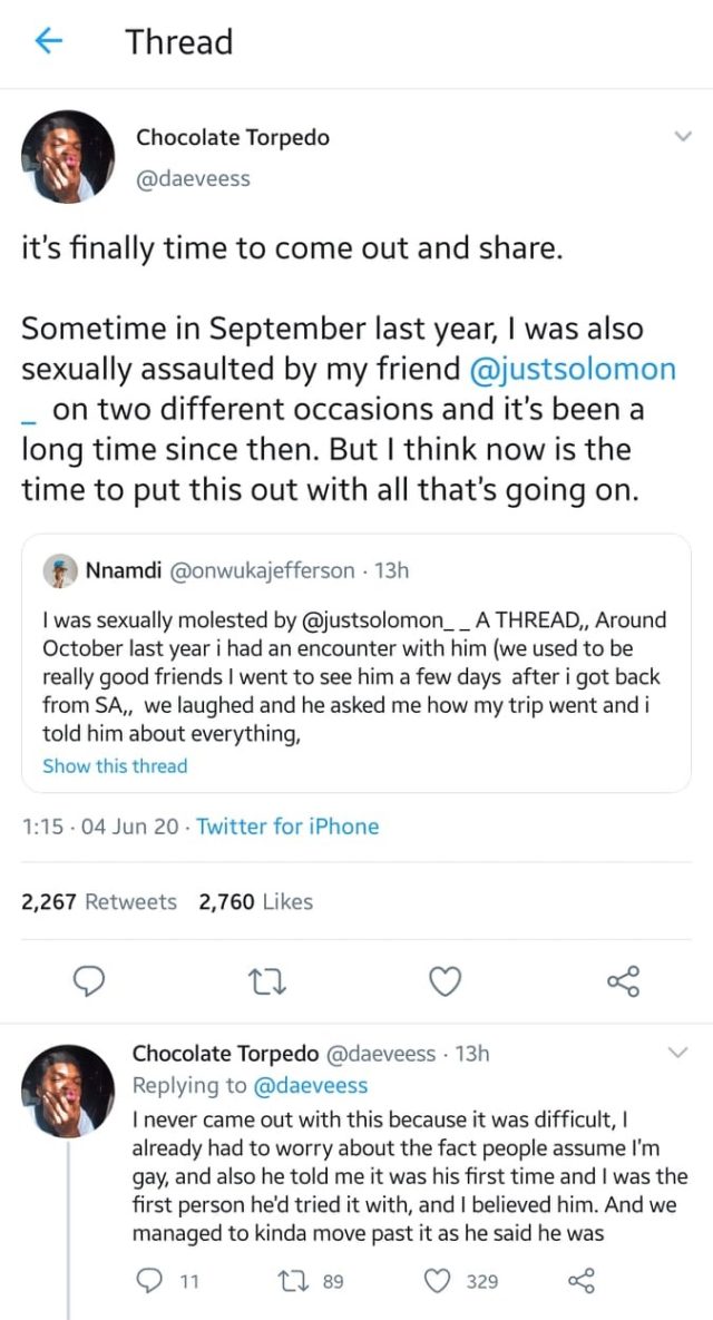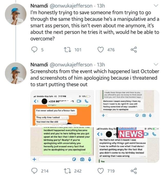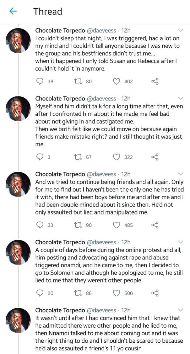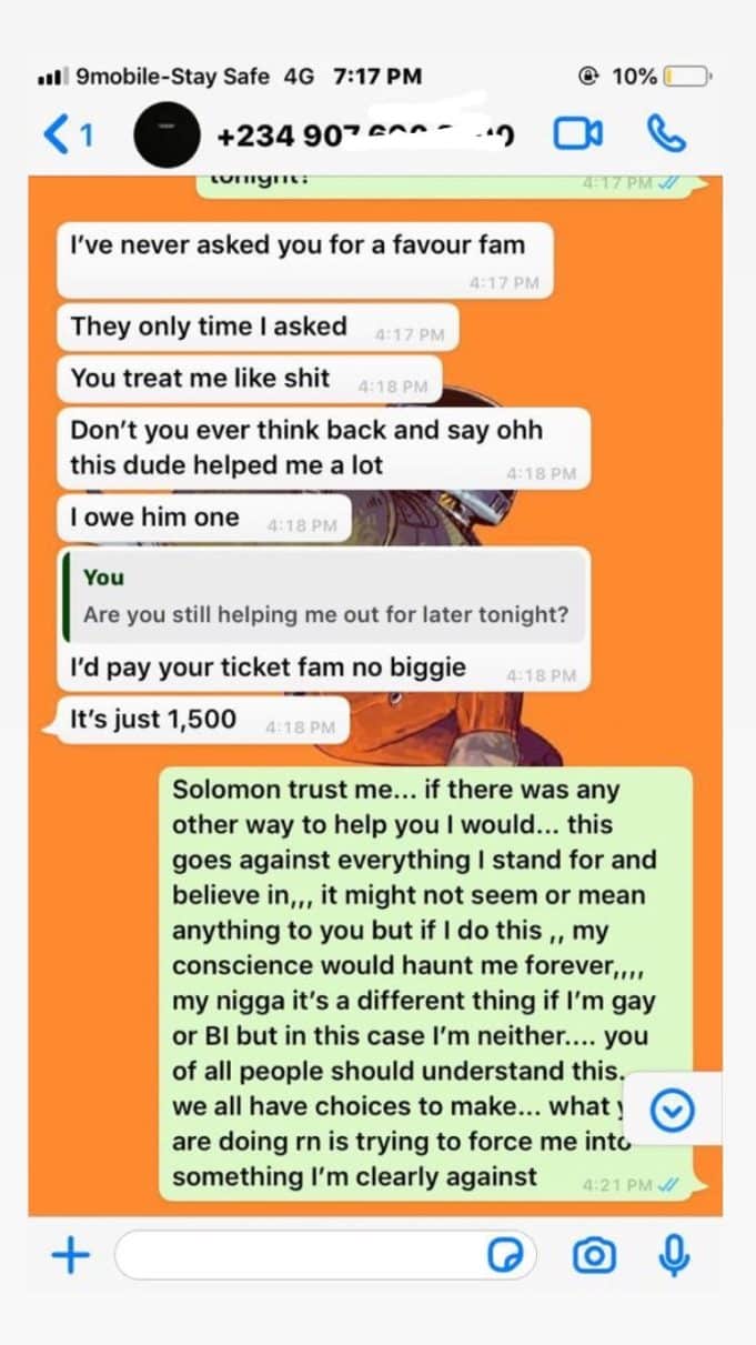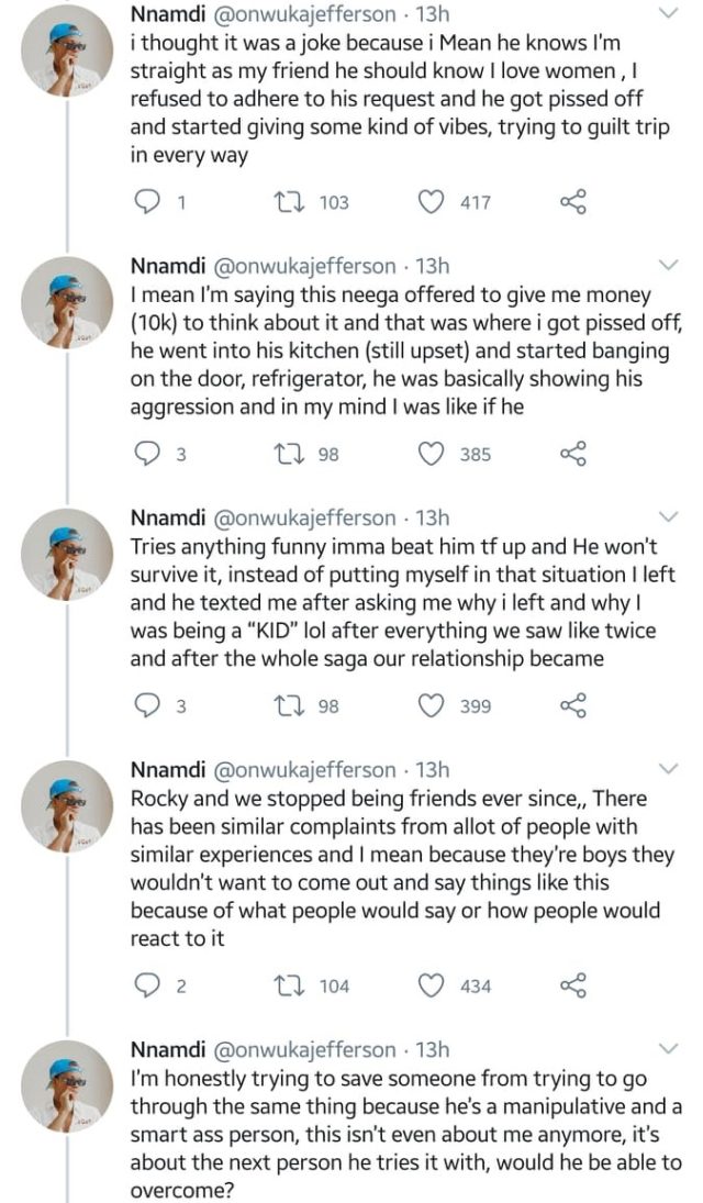 i thought it was a joke because i Mean he knows I’m straight as my friend he should know I love women , I refused to adhere to his request and he got pissed off and started giving some kind of vibes, trying to guilt trip in every way”, one of the accuser identified as Nnamdi wrote.