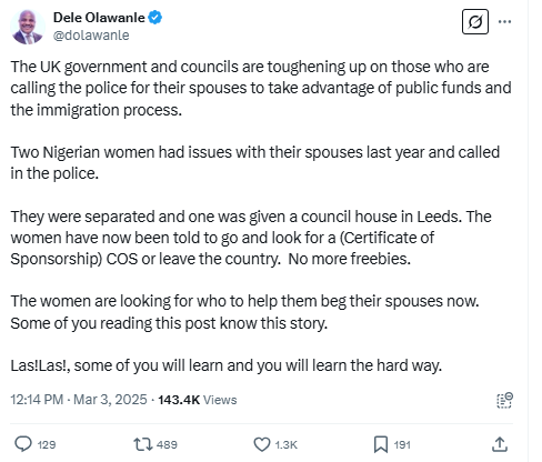 According to the lawyer identified as Dele Olawanle, the UK government has decided to toughen up its immigration laws, particularly on immigrants who are calling the police on their spouses in order to take advantage of public funds.