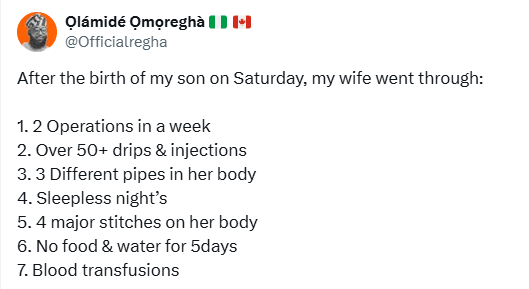 “After the birth of my son on Saturday, my wife went through: 1. 2 Operations in a week 2. Over 50+ drips & injections 3. 3 Different pipes in her body 4. Sleepless nights 5. 4 major stitches on her body 6. No food & water for 5 days 7. Blood transfusions,” he wrote.