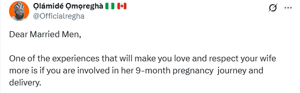 “Dear Married Men, One of the experiences that will make you love and respect your wife more is if you are involved in her 9-month pregnancy journey and delivery.”