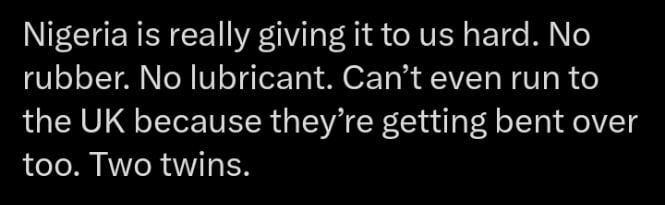 She wrote: “£10 is N17200. Wonderful. Absolutely wonderful. Nigeria is really giving it to us hard. No rubber. No lubricant. Can’t even run to the UK because they’re getting bent over too. Two twins.”