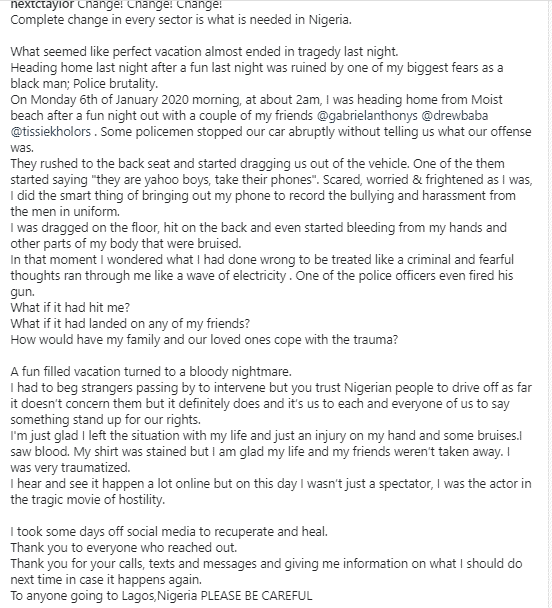 On Monday 6th of January 2020 morning, at about 2am, I was heading home from Moist beach after a fun night out with a couple of my friends @gabrielanthonys @drewbaba @tissiekholors . Some policemen stopped our car abruptly without telling us what our offense was.
