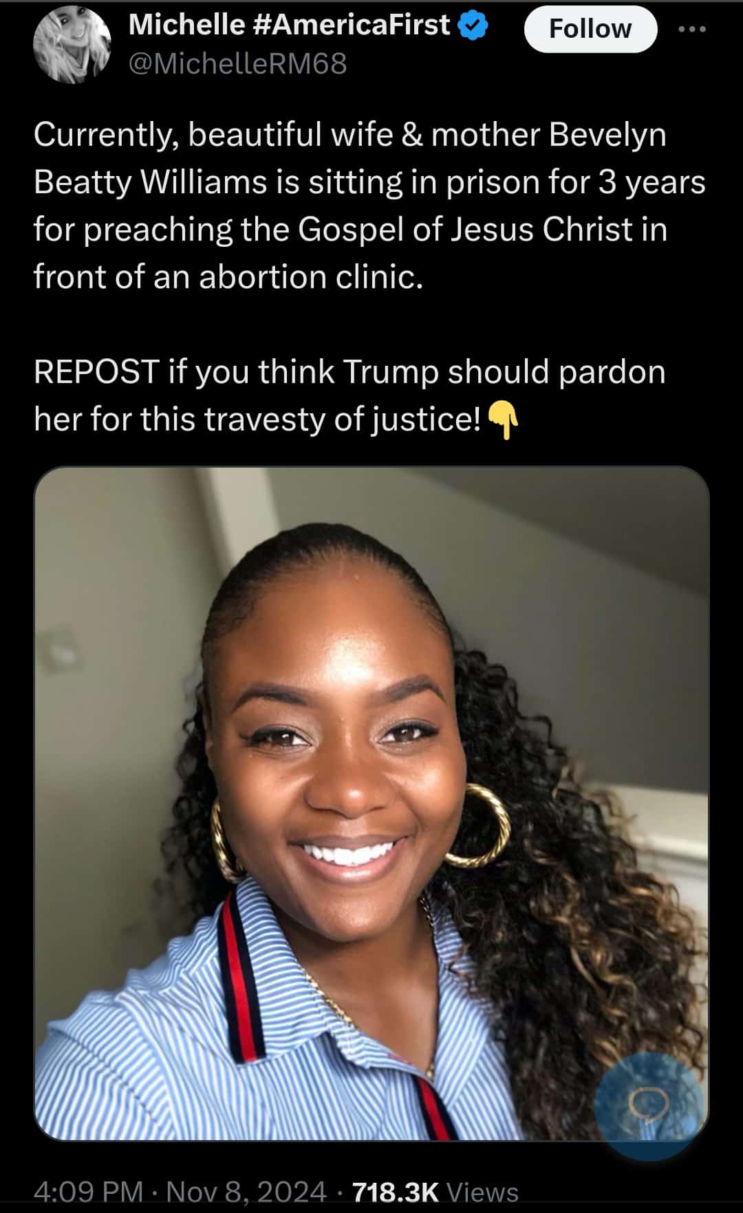 The viral post reads: “Currently, beautiful wife & mother Bevelyn Beatty Williams is sitting in prison for 3 years for preaching the Gospel of Jesus Christ in front of an abortion clinic.”