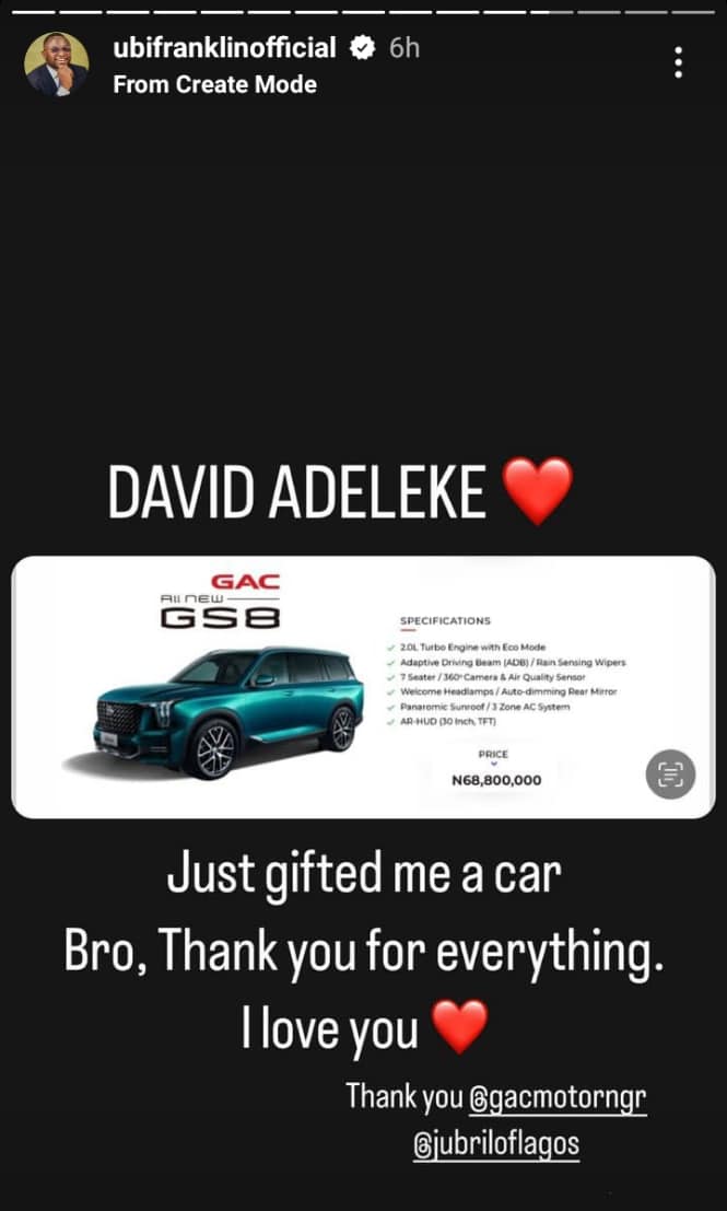 His words: “DAVID ADELEKE ❤️ Just gifted me a car. Bro, thank you for everything. I love you ❤️. Thank you @gacmotorsngr @jubriloflagos.