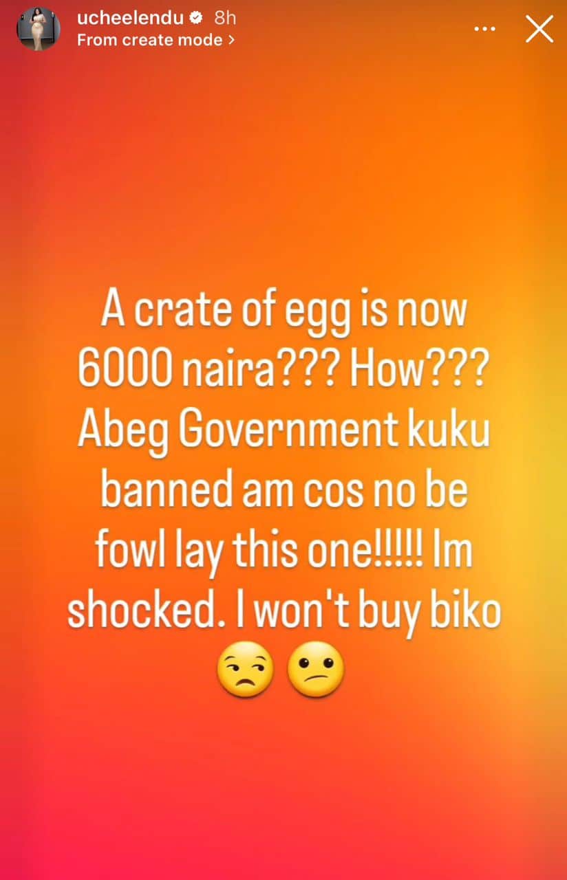 Uche Elendu has joined the bandwagon online as she complains about the new price of a crate of eggs. She questioned why the hike in prices as quizzes if eggs have been banned by the government.