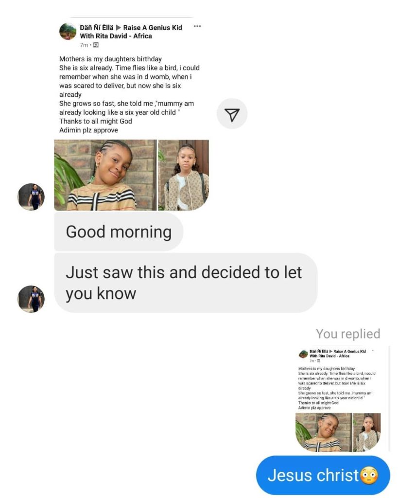 If youre on fb pls help me report b4 they start using her pic to defraud people”.