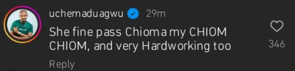 “She fine passes Chioma my Chiom Chiom, and very hardworking too,” Maduagwu said.