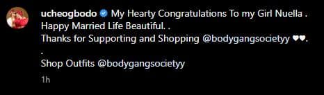 “My Hearty Congratulations To my Girl Nuella. Happy Married Life Beautiful. Thanks for Supporting and Shopping @bodygangsocietyy ♥️♥️.”