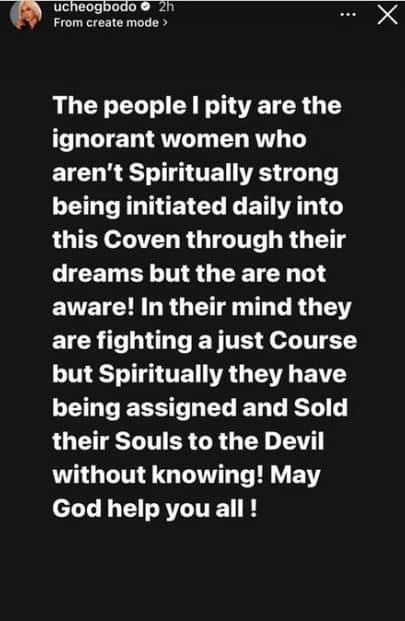 “The people I pity are the ignorant women who aren’t Spiritually strong being initiated daily into this Coven through their dreams but the are not aware! In their mind they are fighting a just Course but Spiritually they have being assigned and Sold their Souls to the Devil without knowing! May