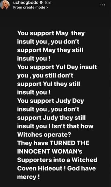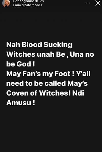 Nollywood actress, Uche Ogbodo continues to drag the fans of May Edochie, calling them “witches” amidst the backlash of blocking their ‘Queen’.