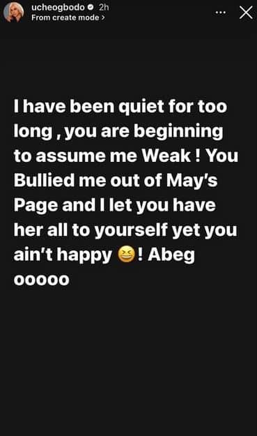 “I have been quiet for too long, you are beginning to assume me Weak! You Bullied me out of May’s Page and I let you have her all to yourself yet you ain’t happy! Abeg ooo.”