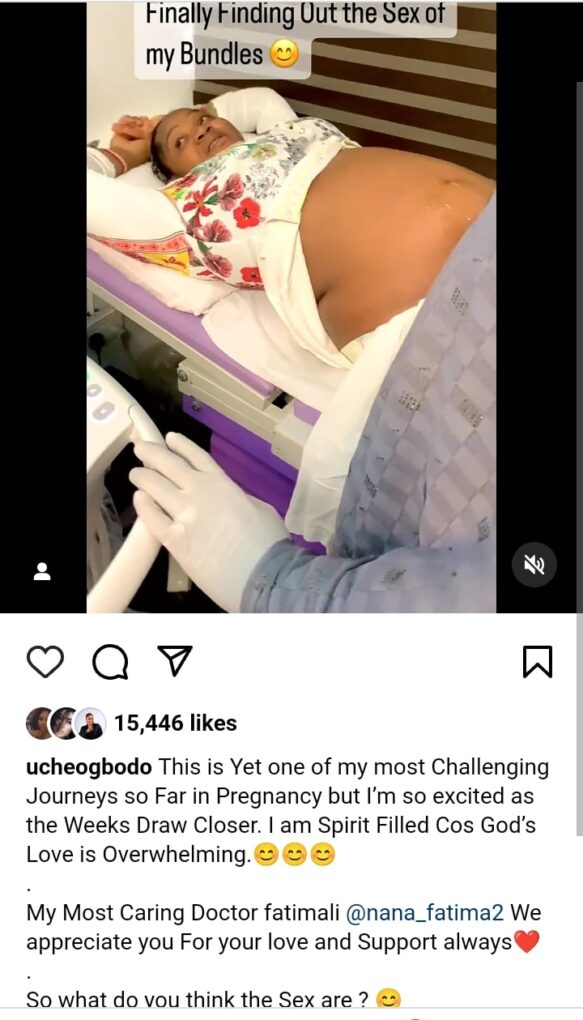 Nollywood actress Uche Ogbodo has taken to her page to share the good news that she is expecting a set of twins soon.