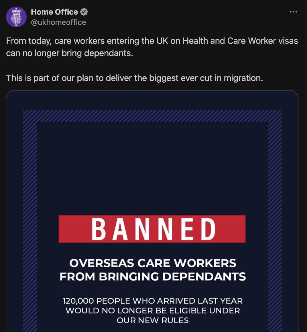 “From today, care workers entering the UK on Health and Care Worker visas can no longer bring dependants. This is part of our plan to deliver the biggest ever cut in migration,” it wrote.