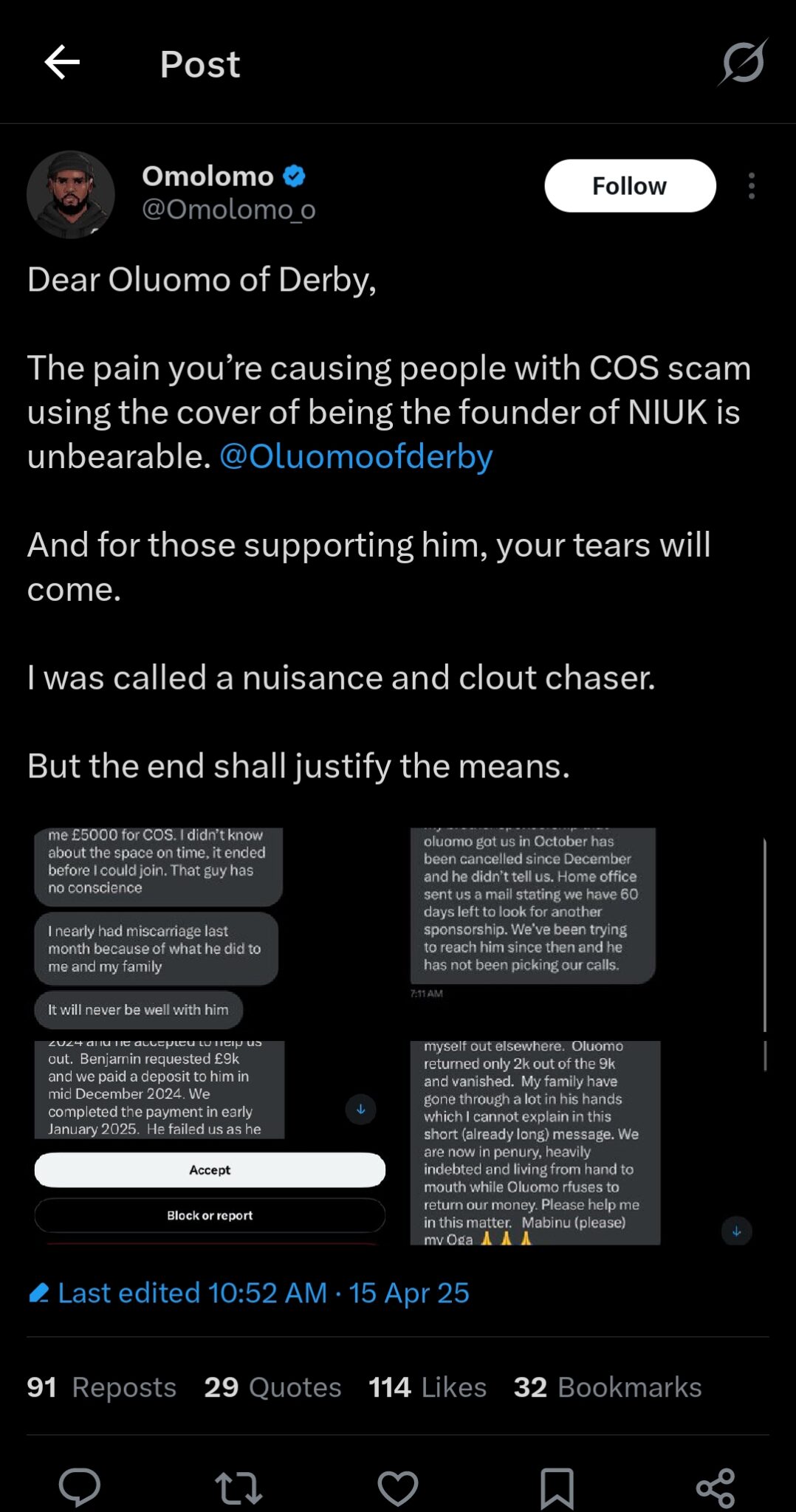 In the post, the whistleblower publicly tagged the accused and wrote: “Dear Oluomo of Derby, the pain you’re causing people with the COS scam, using the cover of being the founder of NIUK, is unbearable. @OluomoofDerby.”