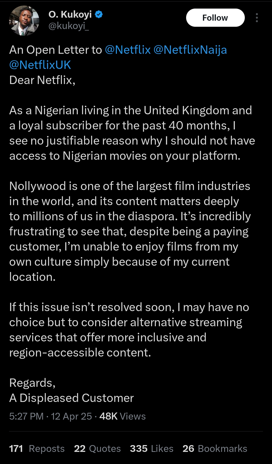 A UK-based Nigerian has publicly called out Netflix, tagging both @NetflixNaija and @NetflixUK in an open letter over the absence of Nigerian movies on the streaming platforms.