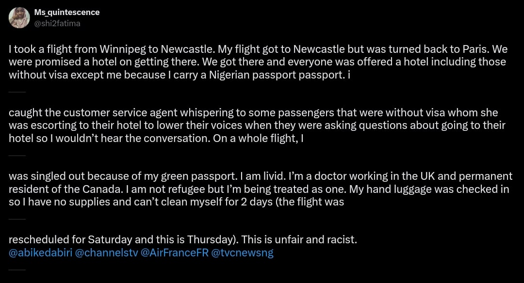 A Nigerian female doctor working in the UK and a permanent resident of Canada has expressed outrage over what she describes as racist treatment after her flight from Winnipeg to Newcastle was diverted to Paris.