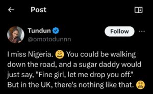 She stated, “I miss Nigeria. 😩 You could be walking down the road, and a sugar daddy would just say, ‘Fine girl, let me drop you off.’ But in the UK, there’s nothing like that.”