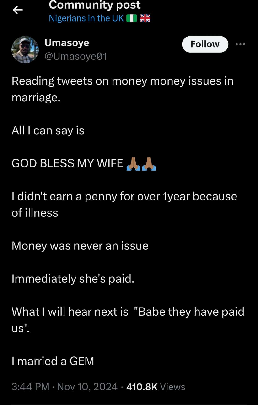 His statement read: “Reading tweets about money issues in marriage, all I can say is, GOD BLESS MY WIFE 🙏🏾🙏🏾. I didn’t earn a penny for over a year because of illness.”