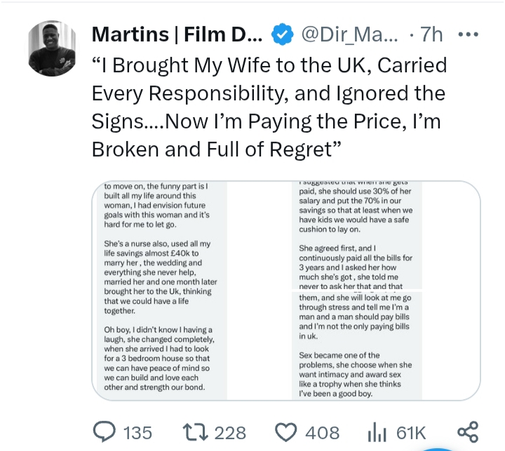 UK-based Nigerian man shares marriage struggles, alleges financial exploitation