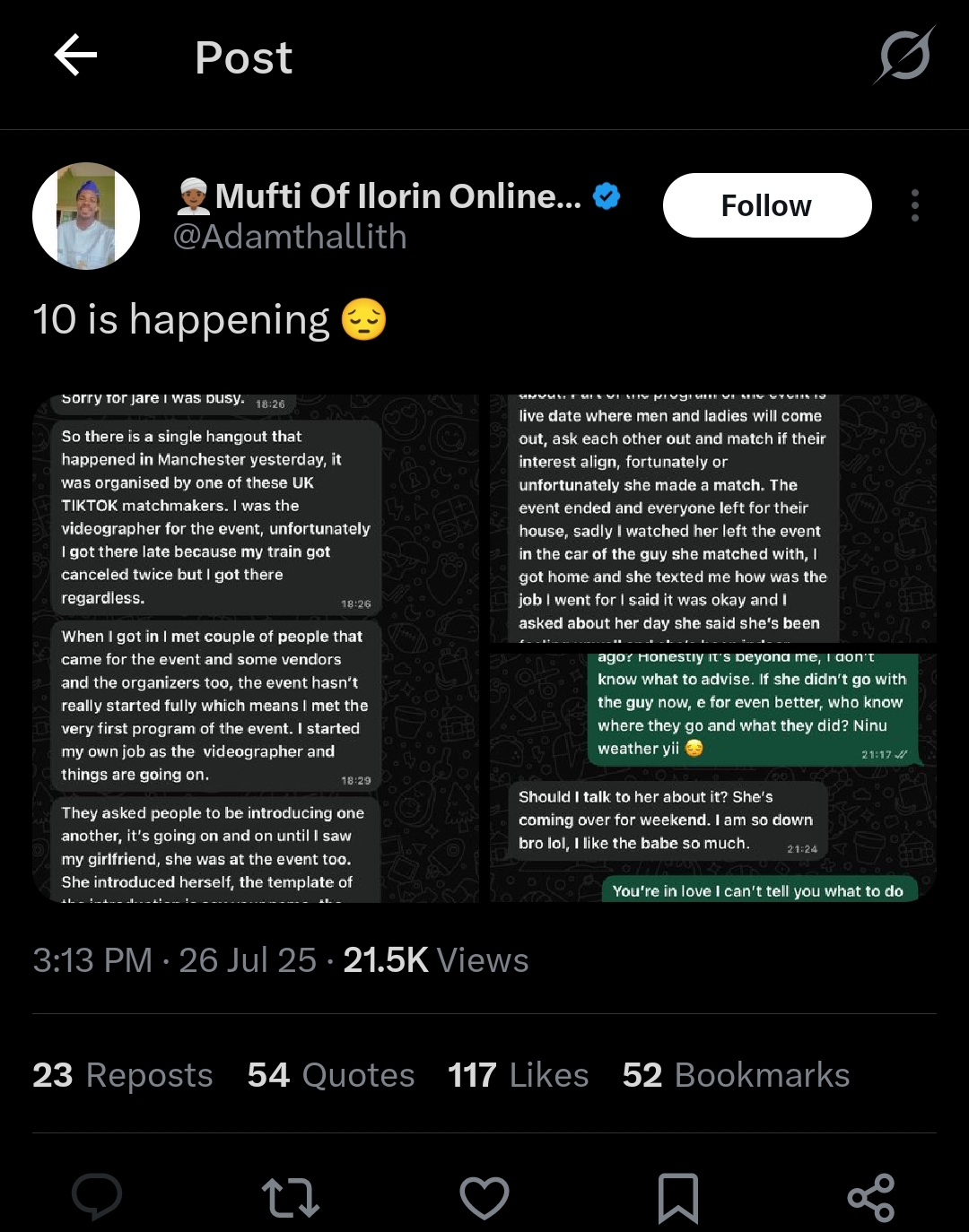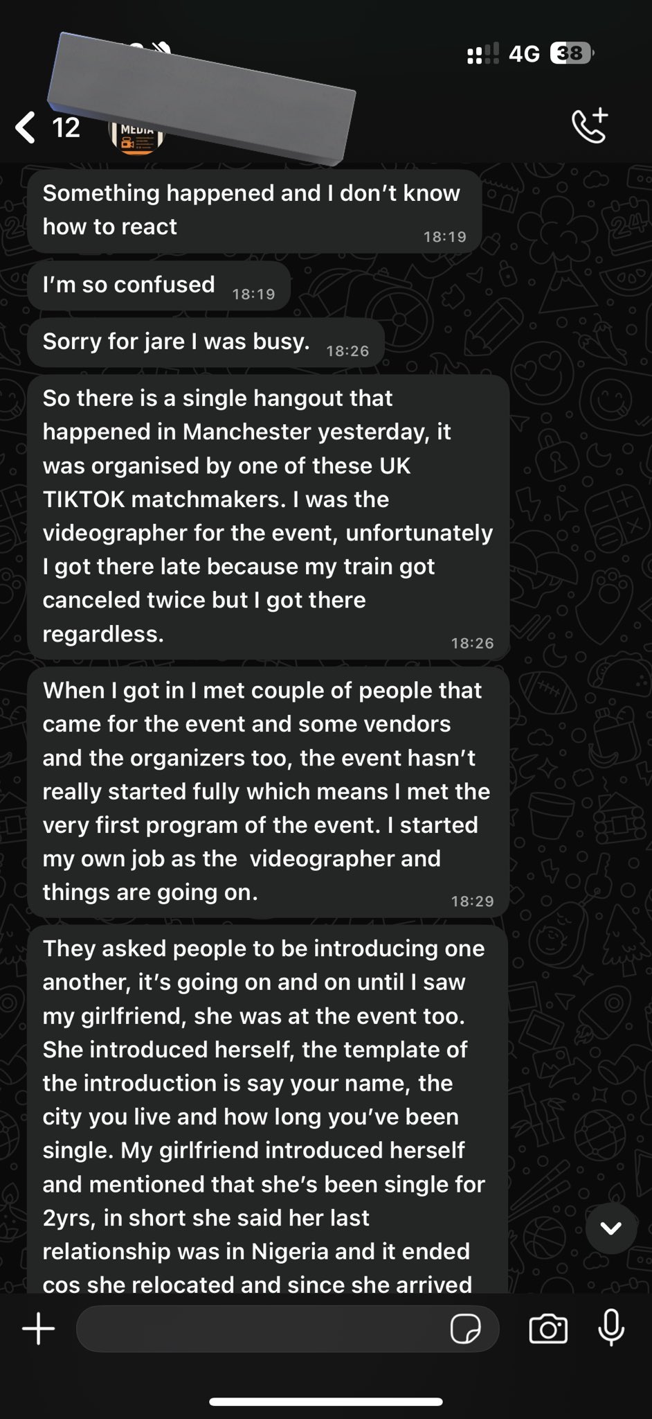 “Something happened and I don’t know how to react. I’m so confused. Sorry for jare I was busy. So there is a single hangout that happened in Manchester yesterday, it was organised by one of these UK TIKTOK matchmakers.”