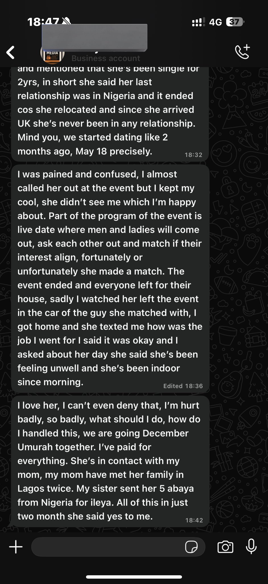 “I love her, I can’t even deny that, I’m hurt badly, so badly, what should I do, how do I handled this, we are going December Umurah together.”